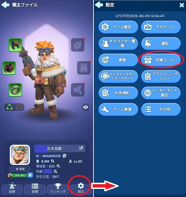 コード入力場所はホーム画面左上の領主アイコンをタップ⇒上記写真の「設定」➡「交換コード」を順にタップで入力画面に移動できます。