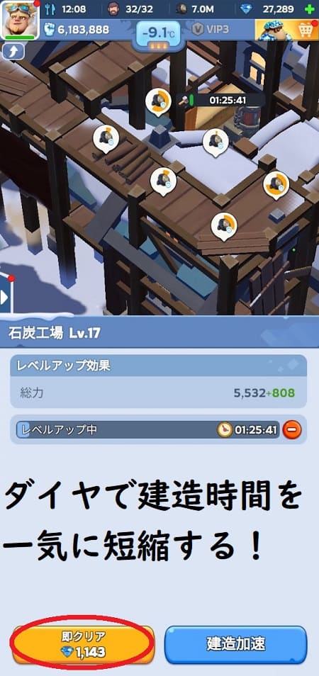 次の使い道は建造時間の短縮です。建造開始時などに上記写真のように「即クリア」と出てきますが、これはダイヤを使って建造時間を短縮するという事です。カネ太郎は貯めたダイヤの半分は建造時間の短縮に使いました。状況を見て使いましょう!