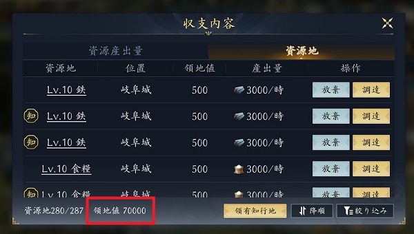 ポイ活条件の領地値とは資源地を占領する事で増えていきます。当然資源地のLvが上がれば、資源地の領地値も増えるので、武将を育成して、よりLvの高い資源地をたくさん占領する必要があります。