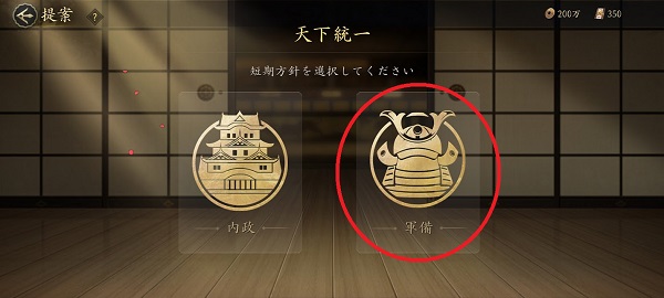 提案は1日1回(8時に更新されます)内政か軍備かを選択して、ちょっとした報酬がもらえるのですが、内政系は途中から不要になるほど資源等は溢れますので、軍備を選択した方がいいです。たまにSSR武将をGETできる事もあるので、毎日忘れずに行いましょう