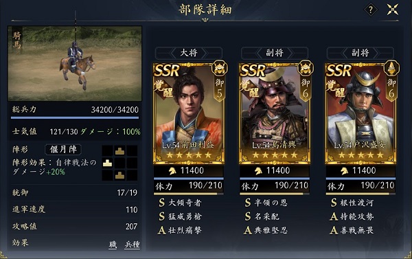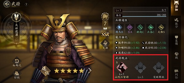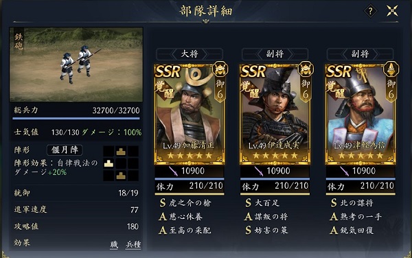 最終的に使う武将はSSR武将のみです。それ以外の武将は序盤少し使いますが、育成する必要はありません(相性等によっては稀に有能な武将もいるようですが・・)。育成する武将の一つの目安として「統卸」の値が大きい武将ほど強いです。ガチャ次第ではありますが、統卸が高いSSR武将を序盤から育成しましょう。