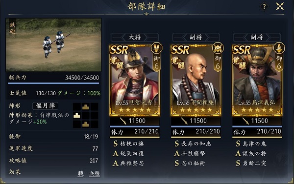 おそらくもっと良い組み合わせはあると思いますが、ガチャの運もかかわって来るので、難しいです。とにかくSSR武将でそろえて置けばまちがいないです。