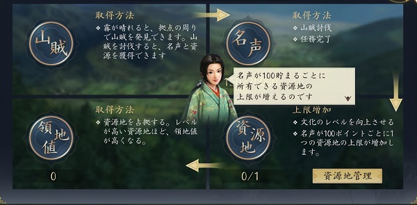 名声が100増えるごとに所有できる資源地が1つ増えます。資源地を占領すると「領地値」が増えるので、つまり名声は高ければ高い程良いです。