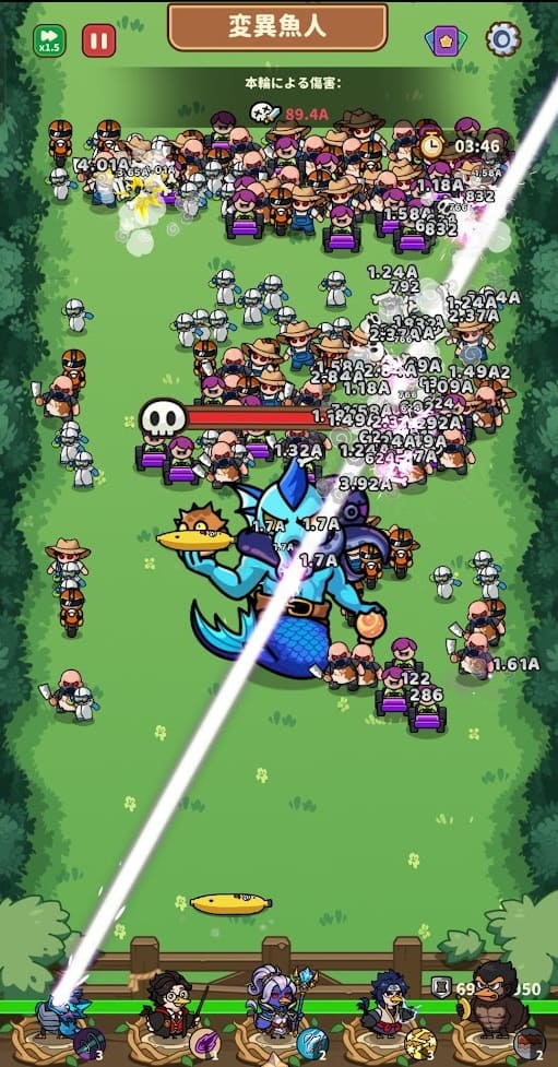 バトルでは最大5体のキャラクターが出せますが、基本1体は「全体攻撃」できるキャラクターを選びましょう。序盤は「いつまでも噴き出す」しか選択肢がありませんので、優先的に選択しましょう。中盤になってくると「チックコング」「ゴッチグラ」「エルーサ」なども選択肢に入ります。チックコングは敵の性能に「迎撃弾道技能」とある場合はバナナがかき消されるので気を付けましょう。