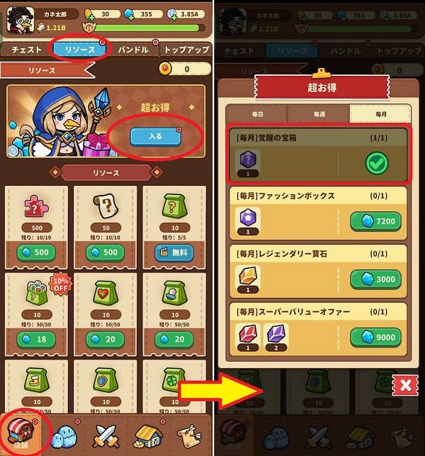 ダイアモンド3,000個と引換に1か月に1回【覚醒の宝箱】をGETできます。この宝箱からは「キャラクター覚醒石」がランダムでGETできます。通常バトル開始時には、【アルカン】ハートしかキャラクターがいませんが、覚醒石があれば、もう1体最初から出す事が出来ます。これはめちゃデカい!