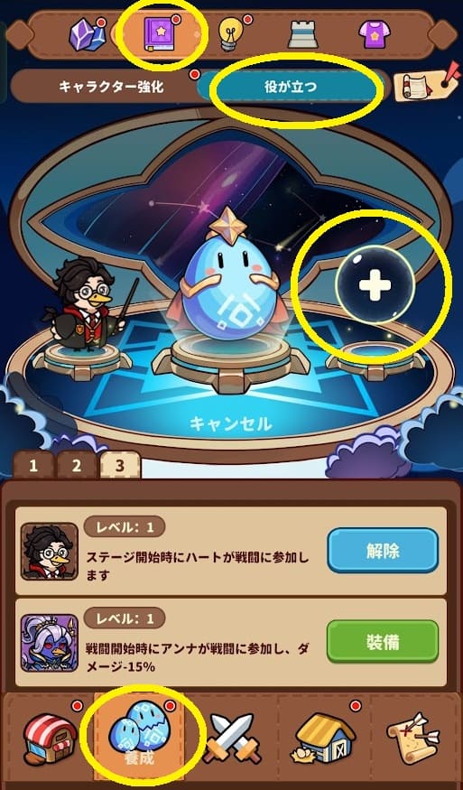 キャラクター覚醒石をGETしたら、ホーム画面下部「養成」➡上部左から2番目の「本のアイコン」➡上部「役が立つ」をタップすると上記写真の画面になります。これは初期配置のキャラクター設定画面です。通常はアルカンのみ配置されていますが、キャラクター覚醒石をセットする事で最初から2体出るようになります。ちなみに左側にセットしたキャラが真ん中に配置されるのですが、これは変更可能です。一度アルカンを解除すれば順番を入れ替えられるので、どちらの方が敵を倒すのに効率が良いか試してみましょう。(例えばレーザーゴッチグラなんかは端にいる方が城前の雑魚を倒す時に多くの敵を攻撃できて効率がいいです)