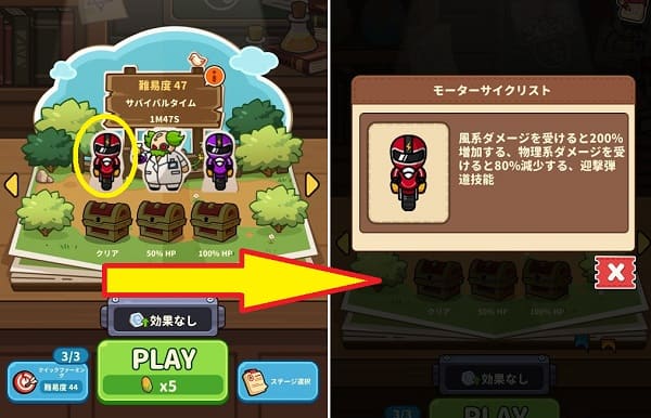 難易度選択画面で上記写真のように出現する敵がいます。これをタップすると敵の詳細を知る事ができます。上記写真のモーターサイクリストでいうと、風系のダメージが200%多く効いて、物理系のダメージが80%減少してしまいます。よって風系のキャラクターで攻めた方がいい。という結論になります。こんな感じで事前に敵の特性を調べて戦いましょう。尚、ボスについては難易度右横の「i」マークをタップすると詳細がわかります。